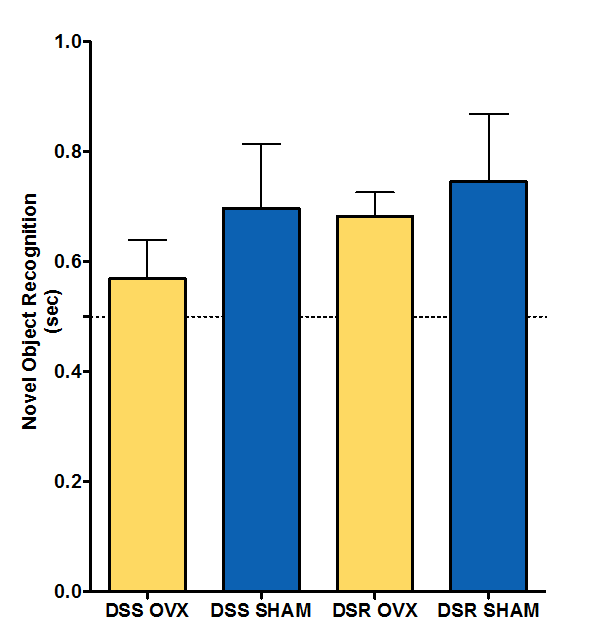 Ovariectomy reduces memory in the novel object recognition test. Rats were ovariectomized (Ovx) or sham-operated at 3 mo of age and tested at 8 mo of age for novel object recognition. n=8/group; *p<0.05 vs Sham.